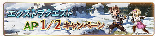 期間中、対象のエクストラクエストにおける消費APが半分となります。対象のクエストにつきましてはゲーム内にてご確認ください。