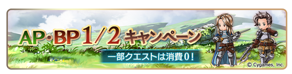 期間中、すべてのメインクエストの消費APが半分になります。また、対象のマルチバトル参戦時における消費AP・BPが半分、もしくは消費無しになります。