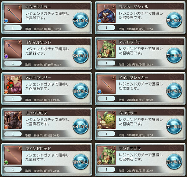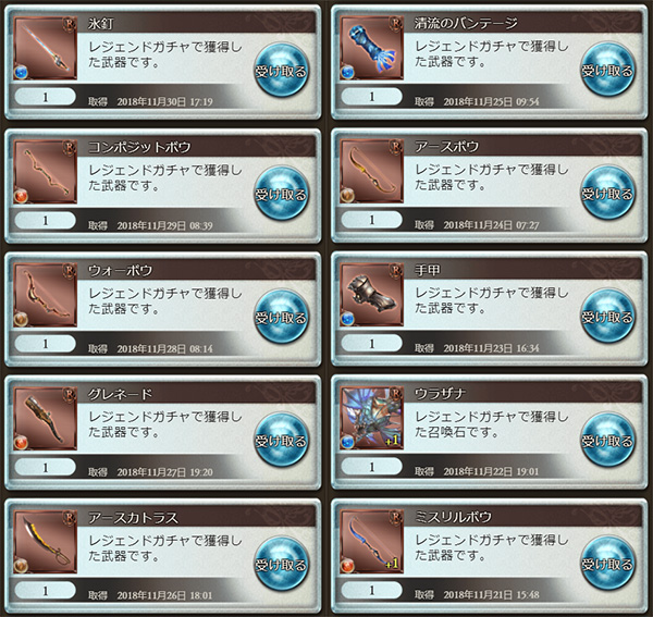 ガチャ結果(1日1回90円2018年11月分)